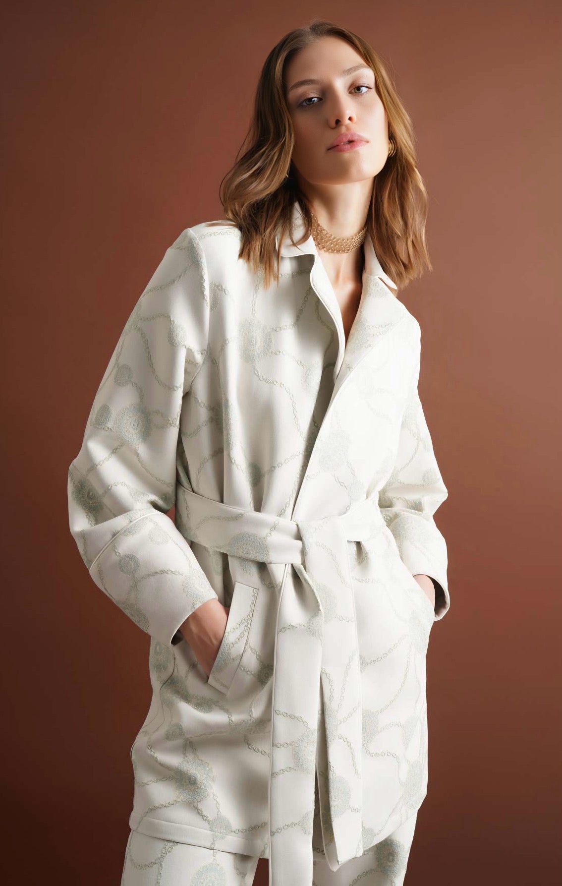 A sophisticated two-piece set featuring a beautiful jacquard or embroidered print in soft green/silver on a cream background. The jacket offers a relaxed fit with a classic lapel and a flattering self-tie belt. Paired with high-waisted, flowy wide-leg trousers, this set creates an effortlessly elegant and modern silhouette.