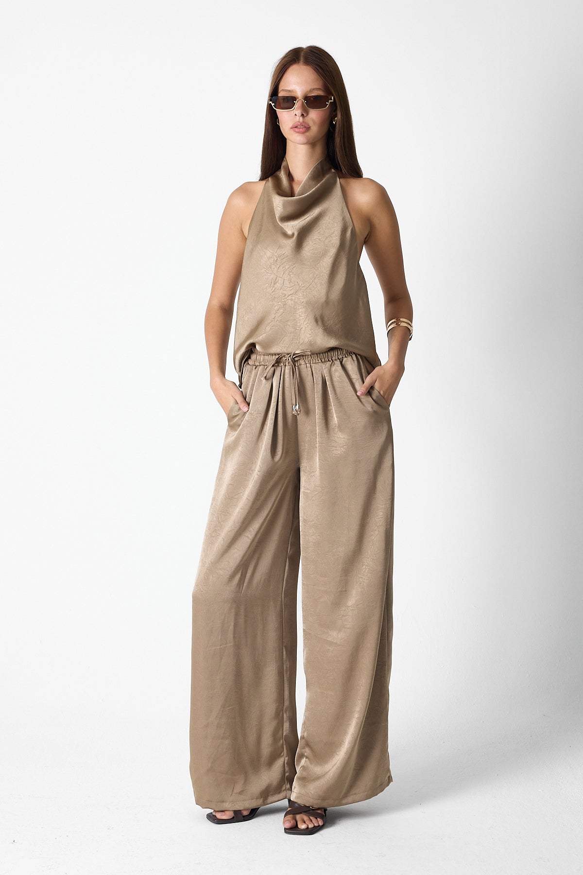 Design: Halter-neck, draped satin top paired with relaxed wide-leg pants for a fluid, refined silhouette.