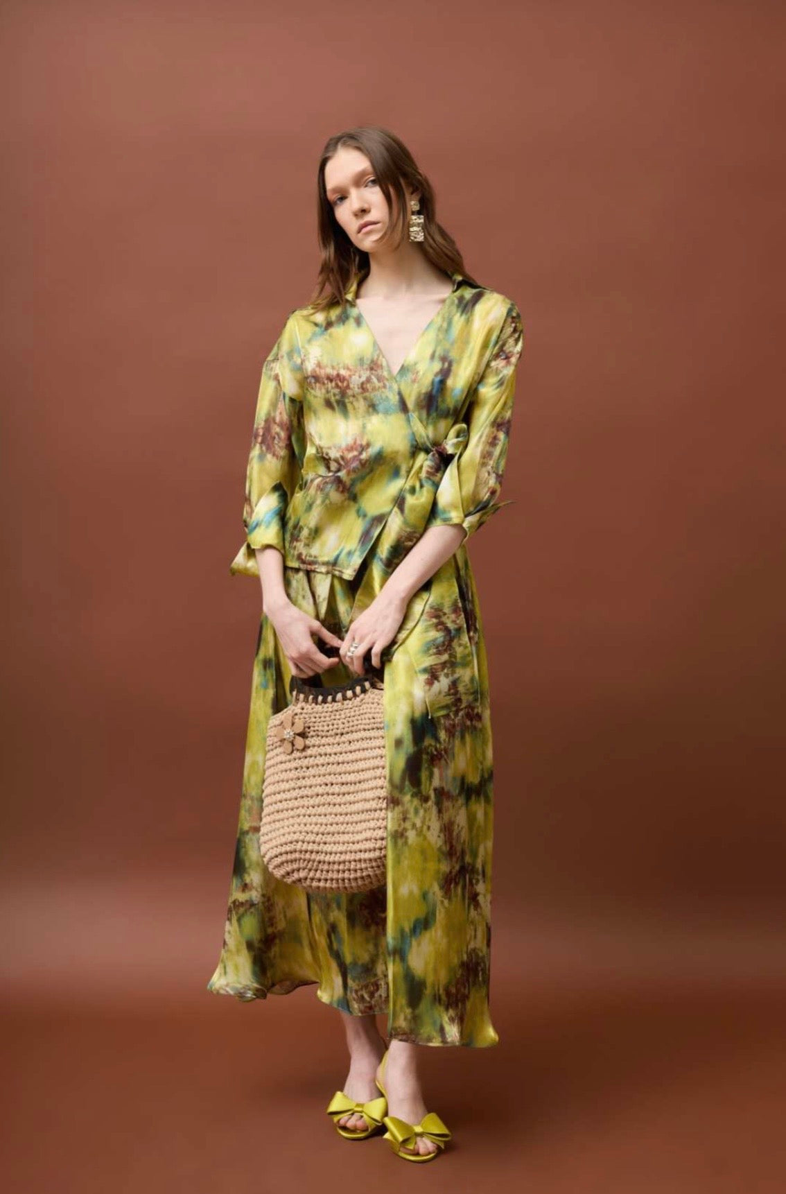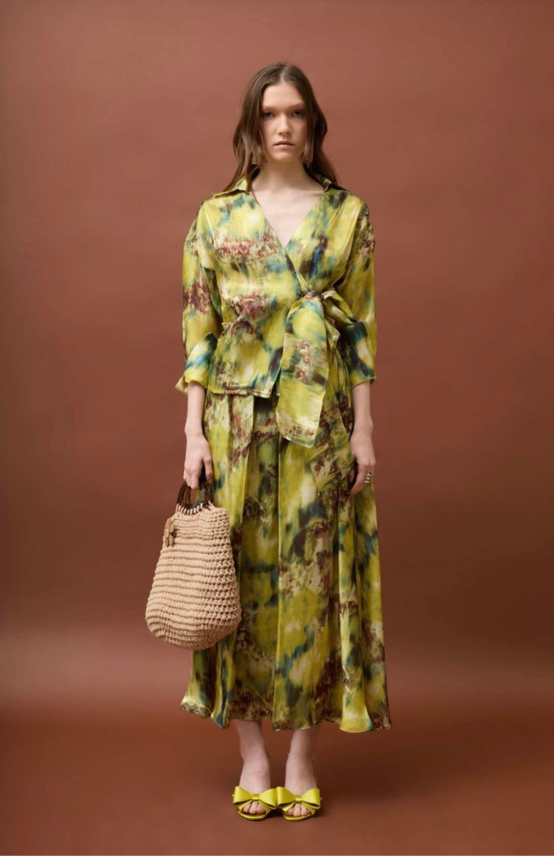 A vibrant and artistic ensemble featuring an abstract tie-dye print on a lightweight, semi-sheer silk fabric. The Tie-Front Wrap Top is designed with a soft collar and three-quarter sleeves, matching the voluminous Pleated Maxi Skirt. The set delivers a bohemian luxury look, perfect for resort holidays or chic summer events.